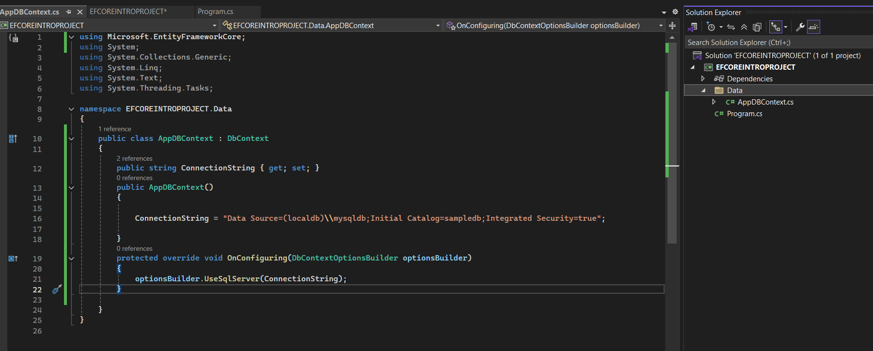 Create Folder called Data in Solution Explorer,inside it create AppDbContext class which is derived from DBContext class.
