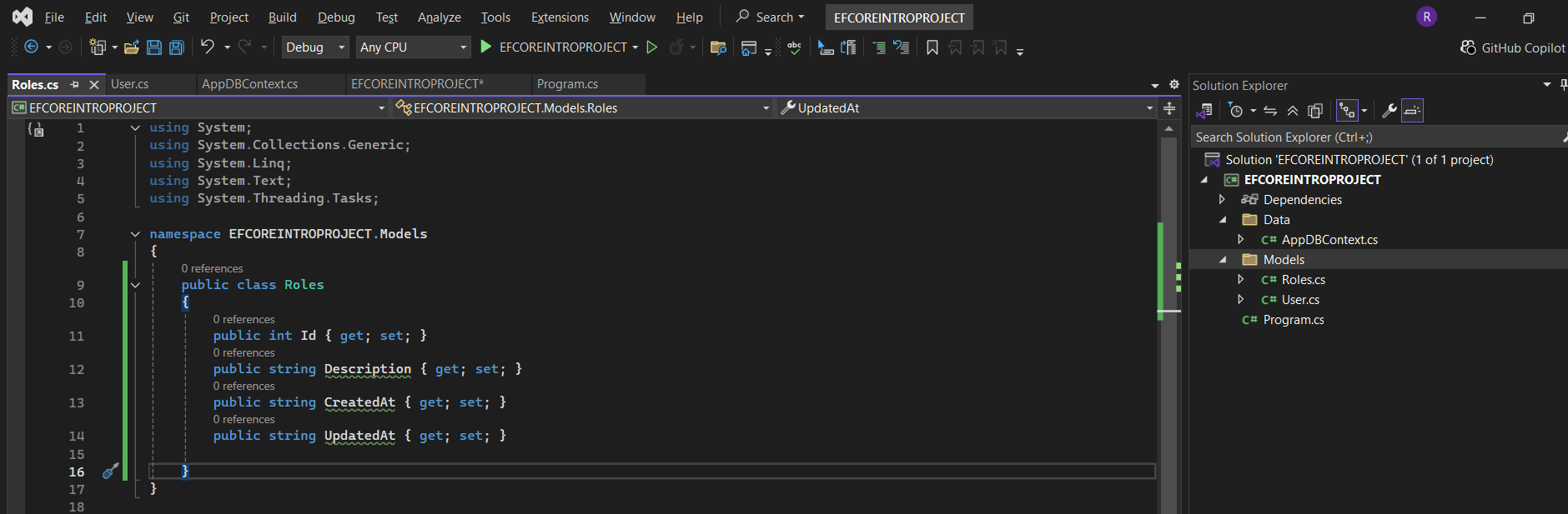 Also create models called Roles class which has properties such as id,description,createdat,updatedat properties.