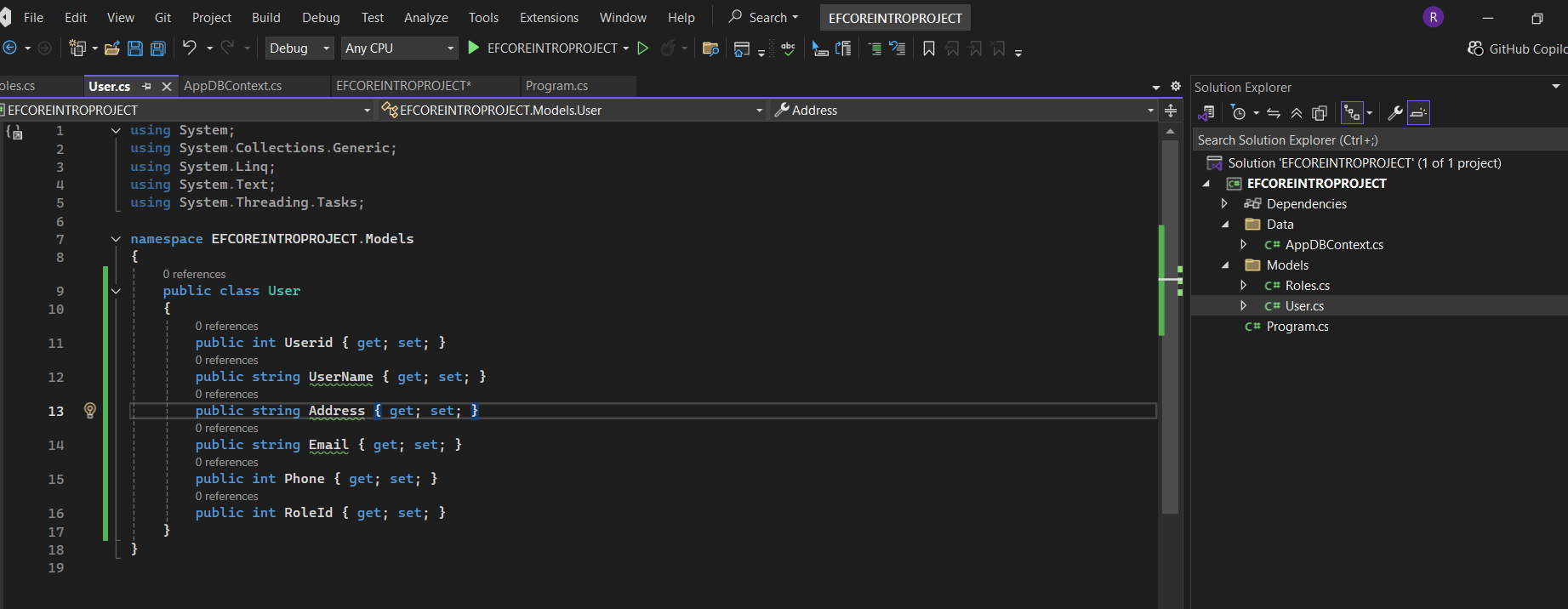 This class has many methods and properties.It has one of the important method called OnConfiguring.Create Models class called User class which has details like userid,username,address,email,phone etc.